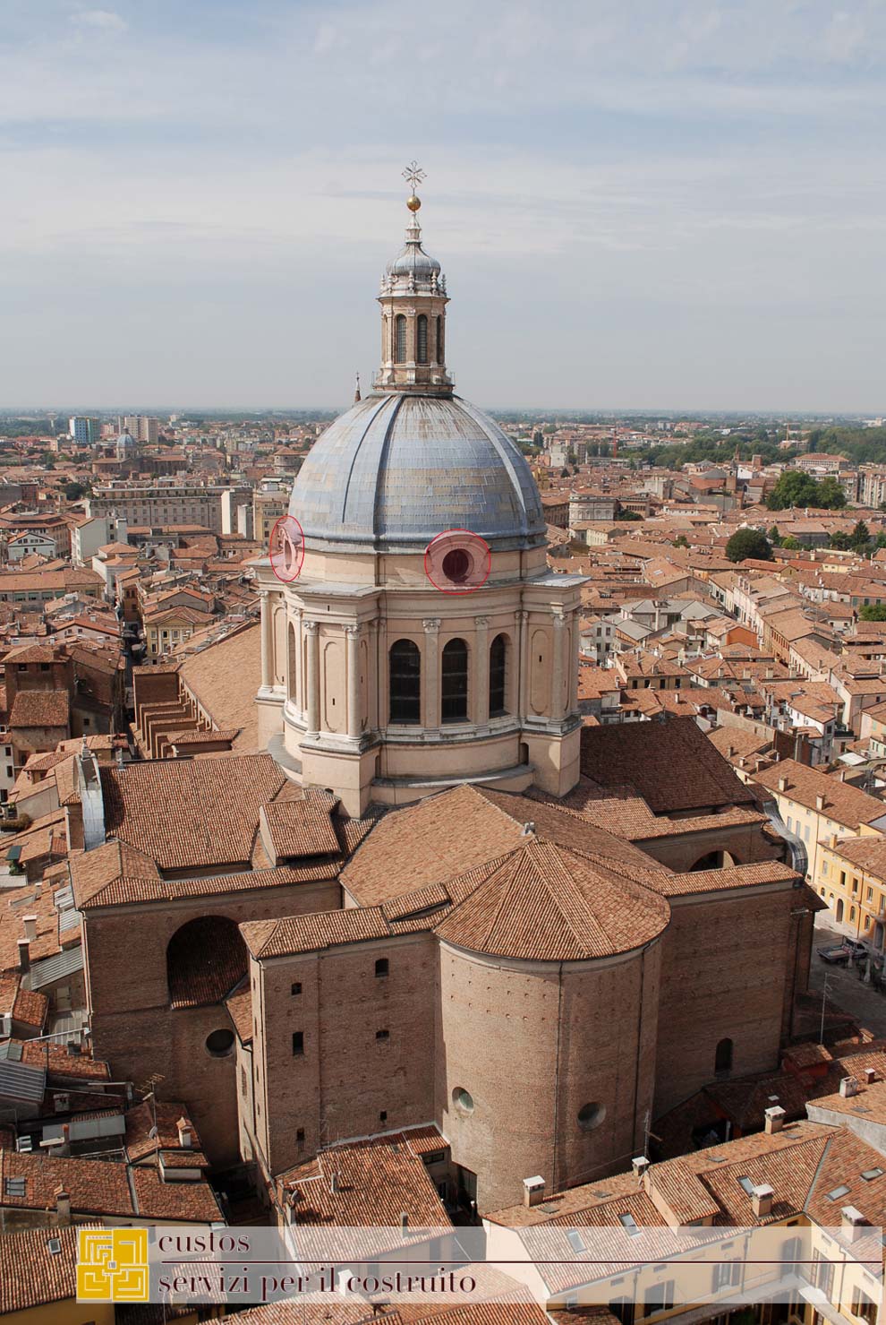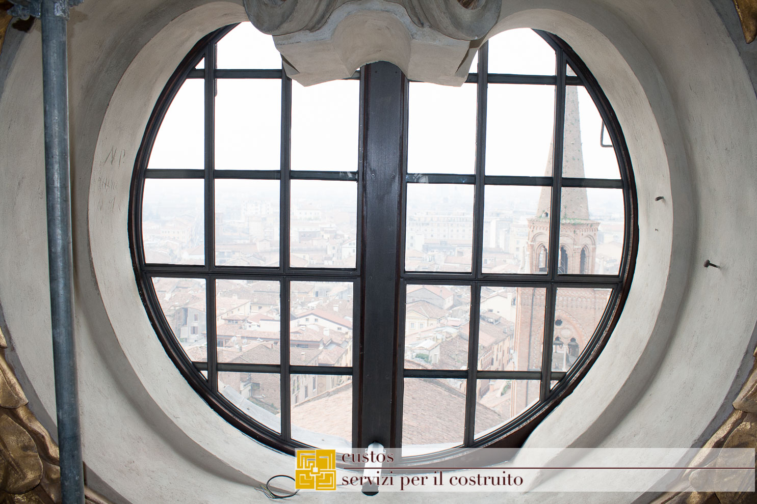 L’incarico ha previsto il rilievo dello stato di fatto con la valutazione dello stato di conservazione dei serramenti esistenti. In accordo con il Direttore dei Lavori e la Soprintendenza, si è deciso di procedere alla sostituzione dei telati lignei fissi con nuovi serramenti metallici che permettono l’apertura motorizzata mediante controllo centralizzato. La modifica permette di controllare il microclima della cupola attraverso l’apertura e la chiusura delle finestra, favorendo le condizioni ideali per la conservazione delle superfici della basilica.