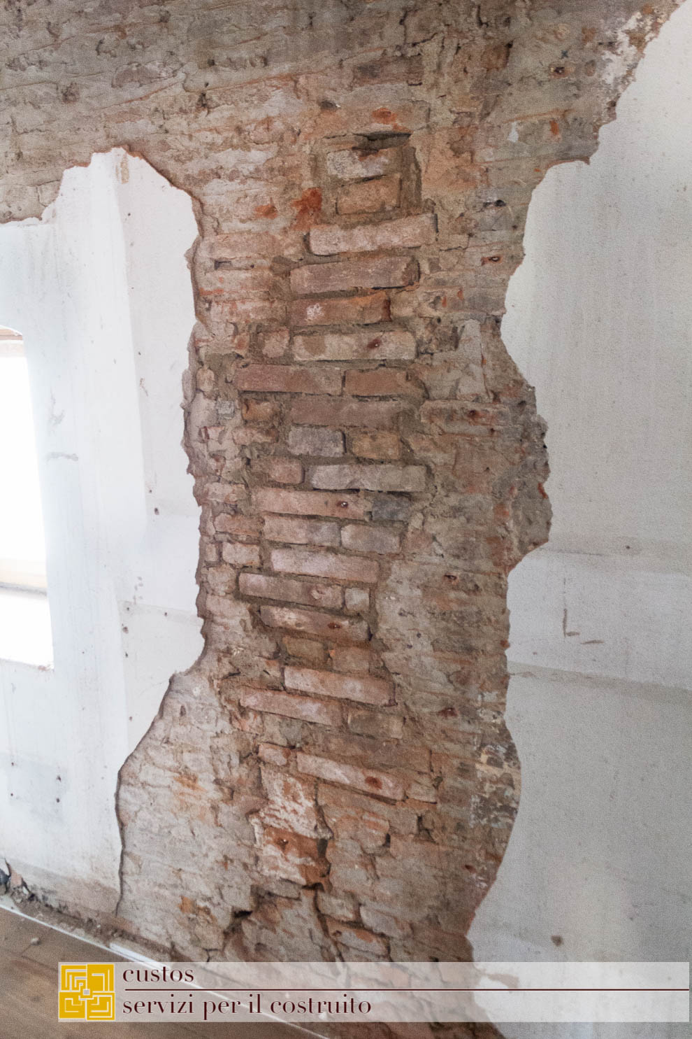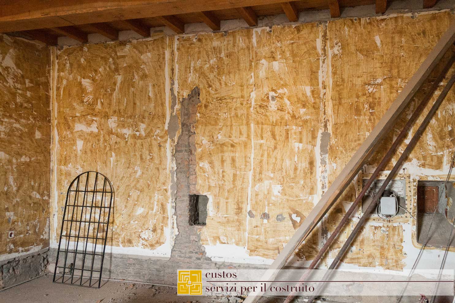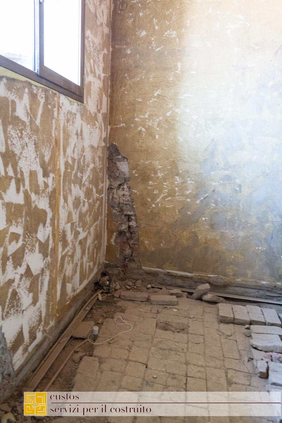 . le demolizioni di pavimenti e sottofondi, ove previsto, ha messo in luce al piano primo nel vano 01.03, un antico solaio ligneo a doppia orditura coperto da un pavimento in mattoni fatti a mano legati da malta magra a base di calce.