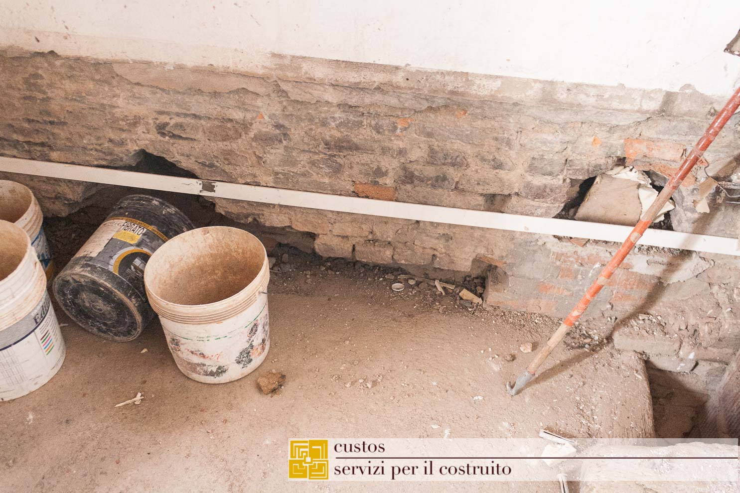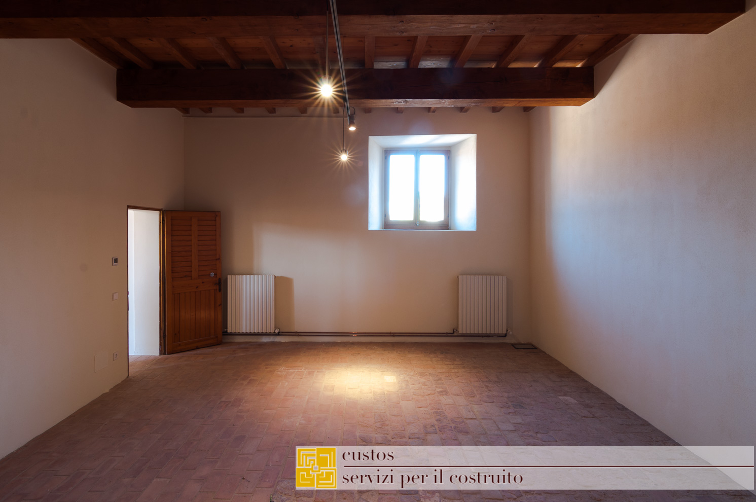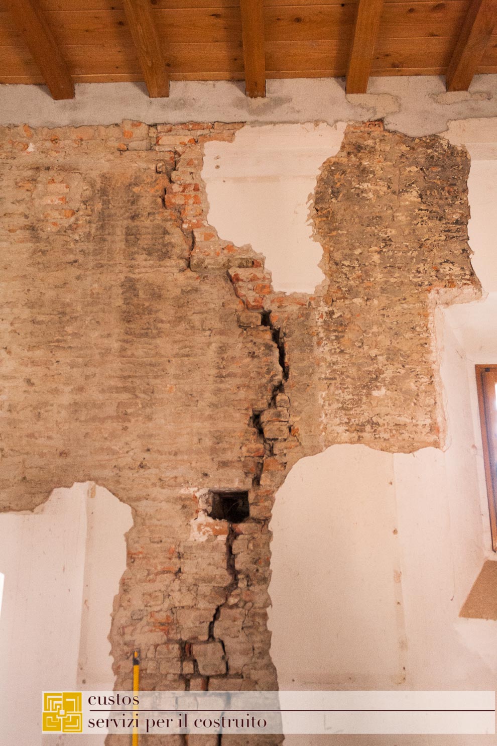 . le demolizioni di pavimenti e sottofondi, ove previsto, ha messo in luce al piano primo nel vano 01.03, un antico solaio ligneo a doppia orditura coperto da un pavimento in mattoni fatti a mano legati da malta magra a base di calce.