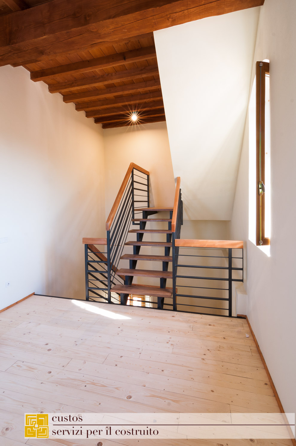. Consolidamento statico e sismico della scala con il prolungamento dei cosciali delle rampe della scala fino ad appoggiarsi alla muratura portante. La struttura, realizzata negli anni ‘70 dall’architetto Vinicio Vecchi, viene poi messa a norma con l’inserimento di tubolari orizzontali ai parapetti in struttura metallica;