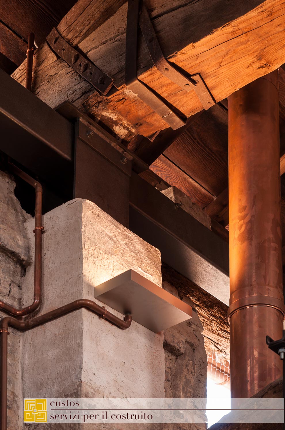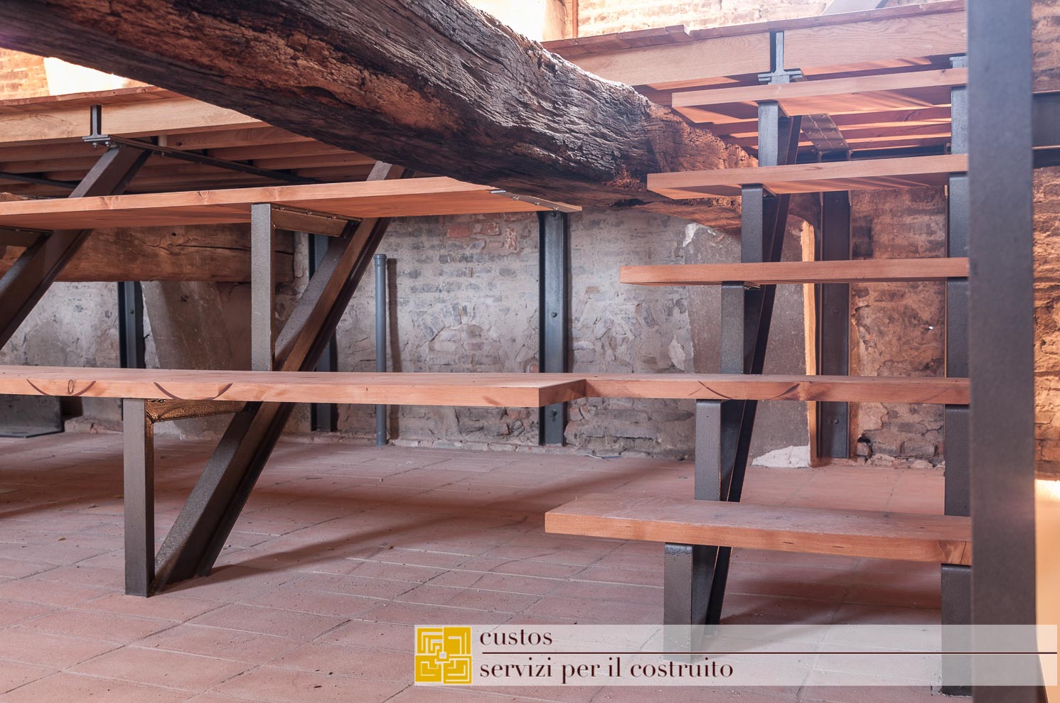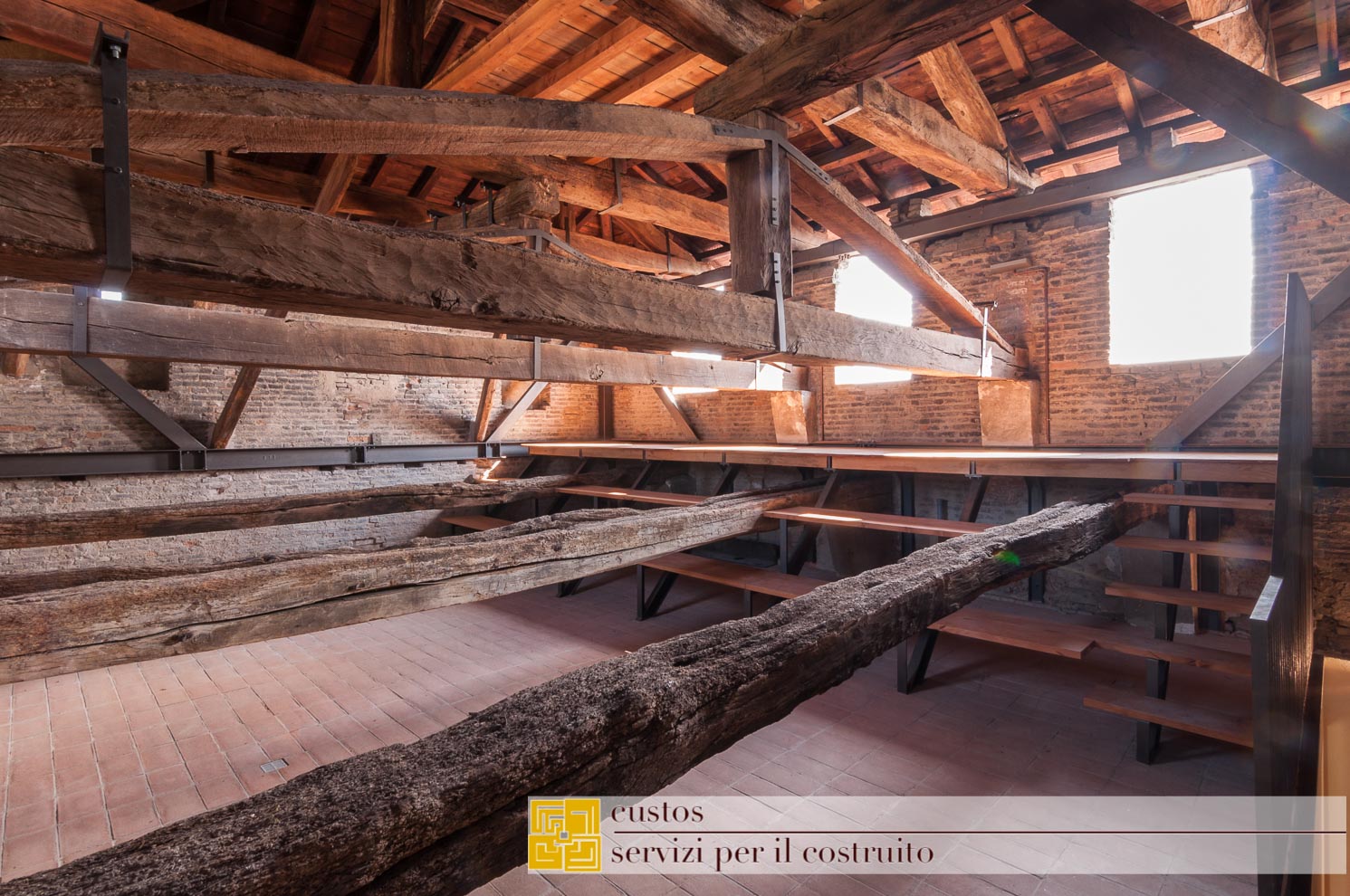 . la sostituzione dei solai incongrui di tipo “Varese” con nuovi solai lignei a doppia orditura. Ciò consente un adeguamento sismico e insieme un alleggerimento delle masse;