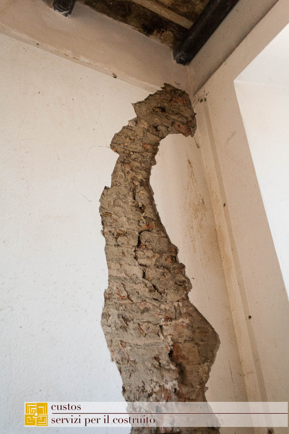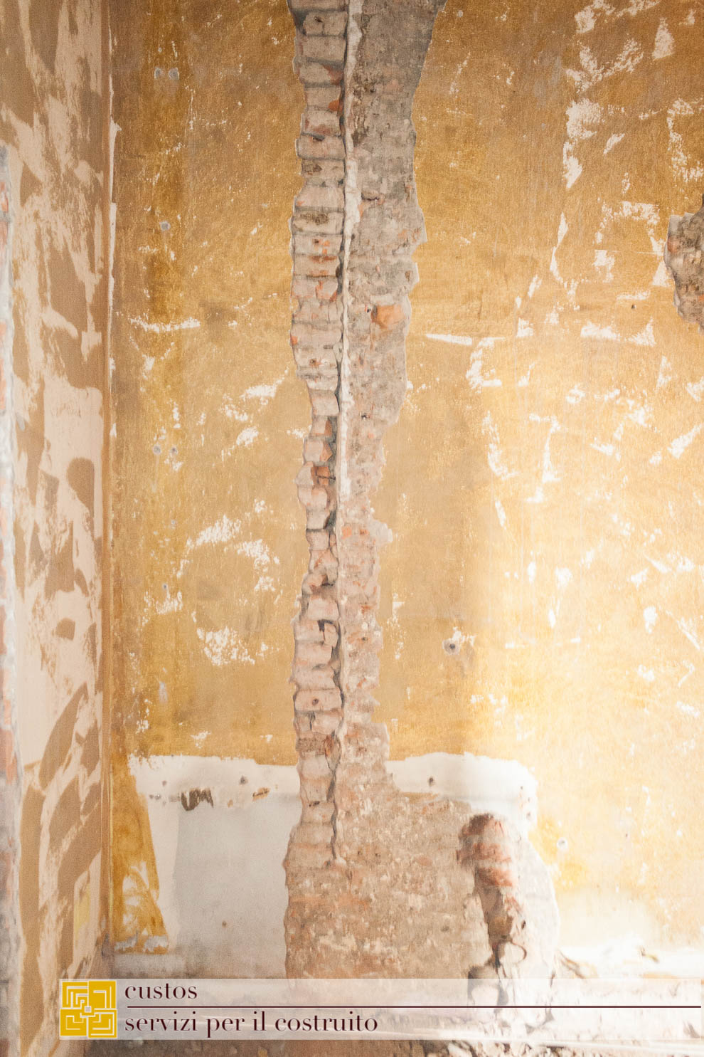 . ricucitura della canna fumaria nella muratura meridionale rinvenuta durante i lavori, celata da una fodera in mattoni forati;